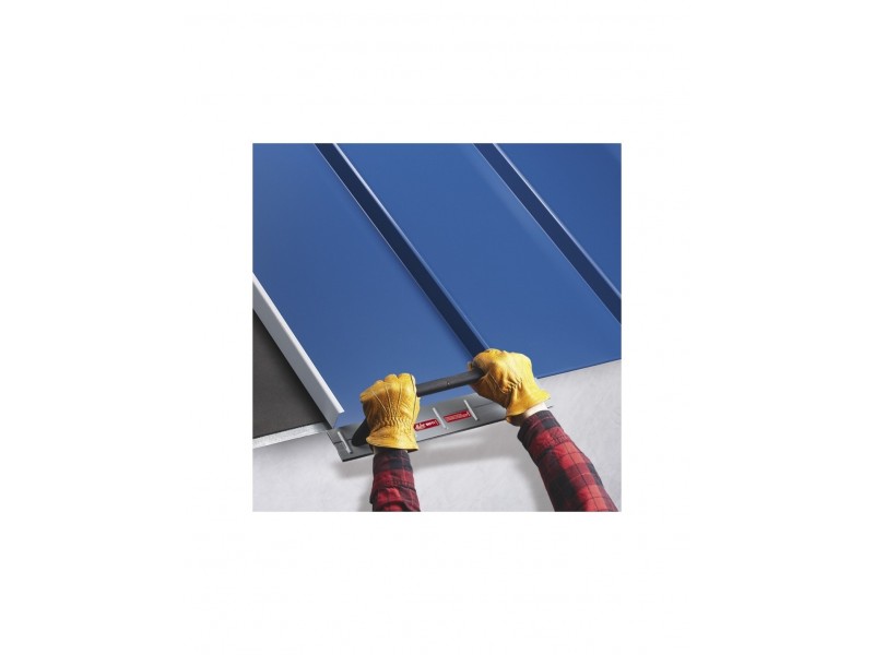Versatile, compact 46 cm drip edge folding tool makes quick bends along the drip edge of flat-pan standing seam metal roofing panels. Two rib-reinforced steel plates are permanently welded together to create two folding seams for making 25.4 mm and 38.1 mm deep bends in maximum 0.76 mm steel. A two-post-design, fiberglass reinforced nylon handle offers durable, lightweight strength and high leverage for working overhead or on a bench.